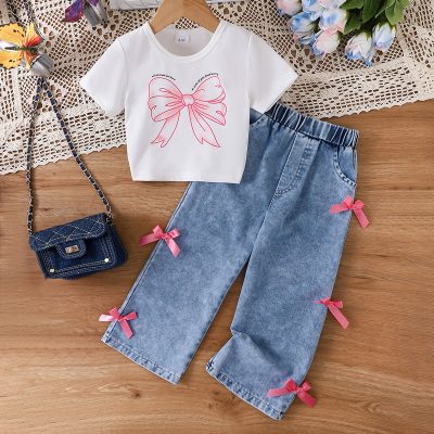 Bowknot Girls’ Printed Short Sleeves with Long Pants Set