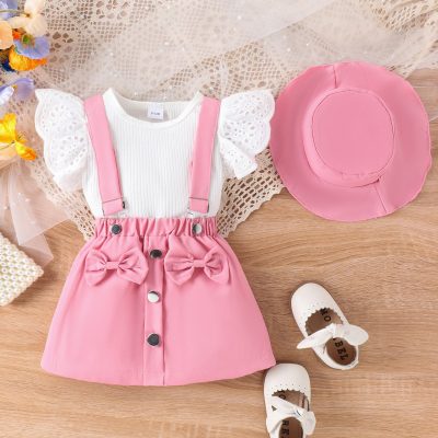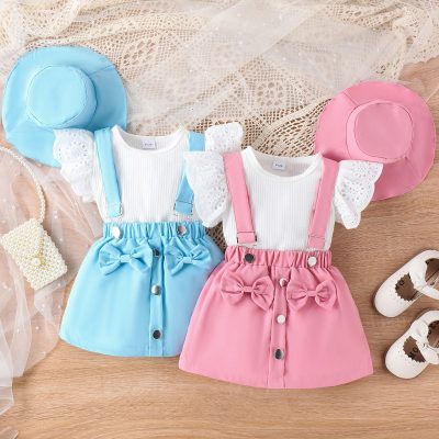 Girls Flying Sleeve Top with Suspender Skirt Hat Girls Set