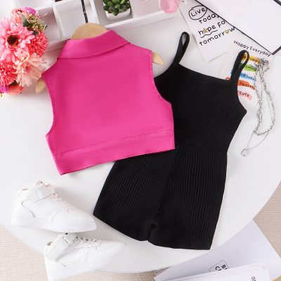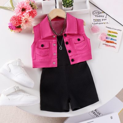 Girls’ jacket with flower suspenders and shorts three-piece suit