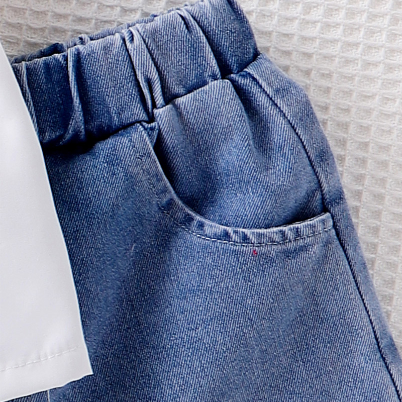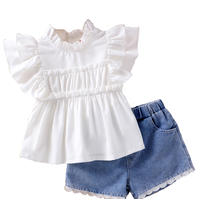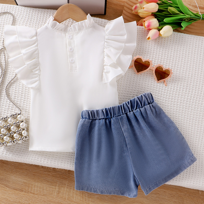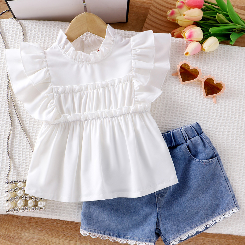 Let your baby soak up the sun and smile! This cute two-piece set includes a charming flying sleeve top with a delicate lace collar and fashionable denim shorts with sweet lace trims. Easily create a lively and playful everyday look. Girls suits, girls two-piece suits, flying sleeve tops, lace collar tops, denim shorts, lace shorts, cute girls clothes, fashionable girls suits, summer girls clothes, little girls clothes, baby girls suits