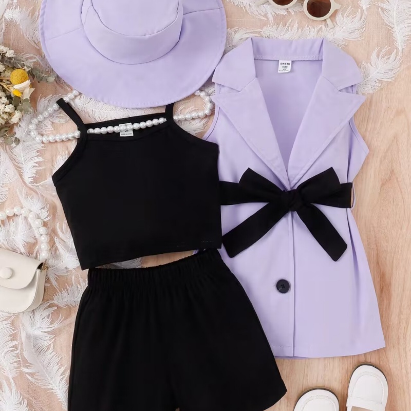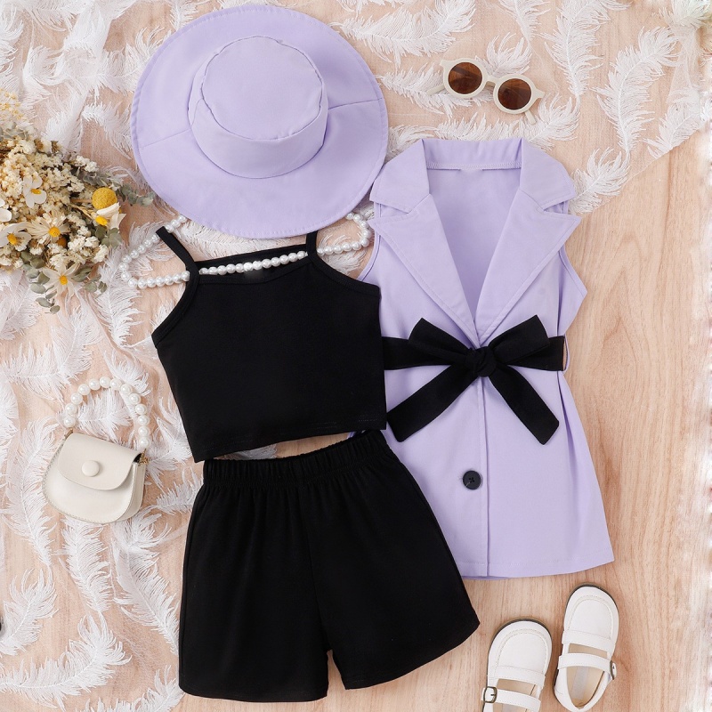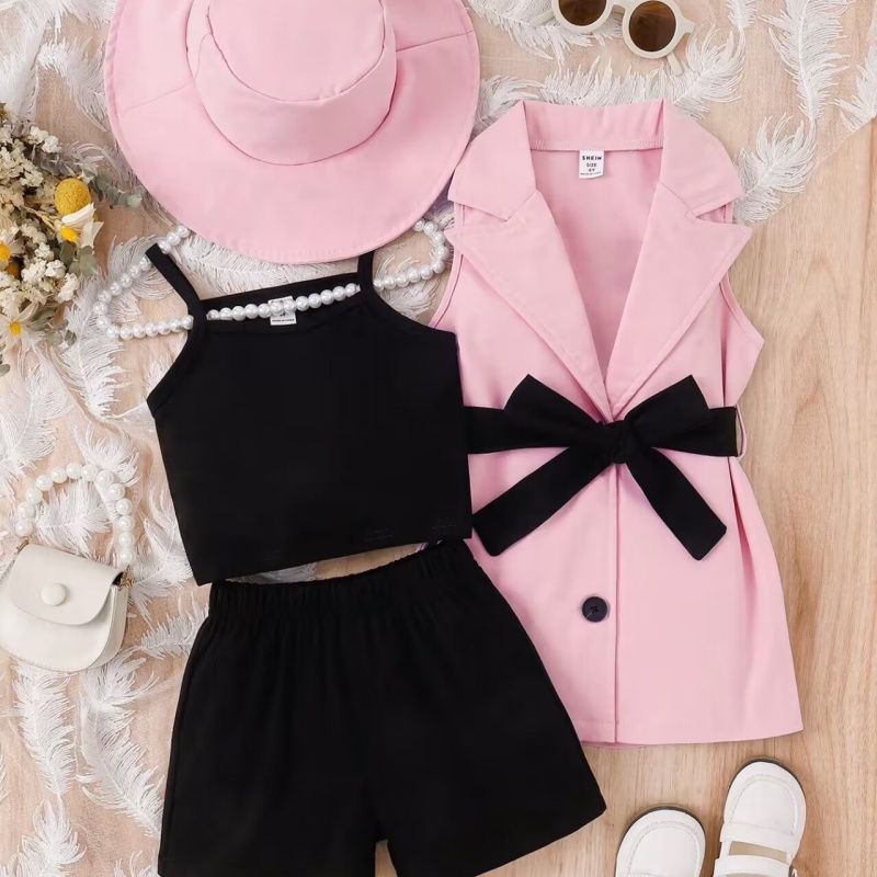 This French girls sleeveless suit summer camisole set, made of light and breathable fabric, with a cute lapel design and tie-hood, is perfect for all occasions. Girls summer suit, French camisole, lapel design, tie hat, girls sleeveless suit, summer fashion suit, lapel suit, summer fashion girls clothing
