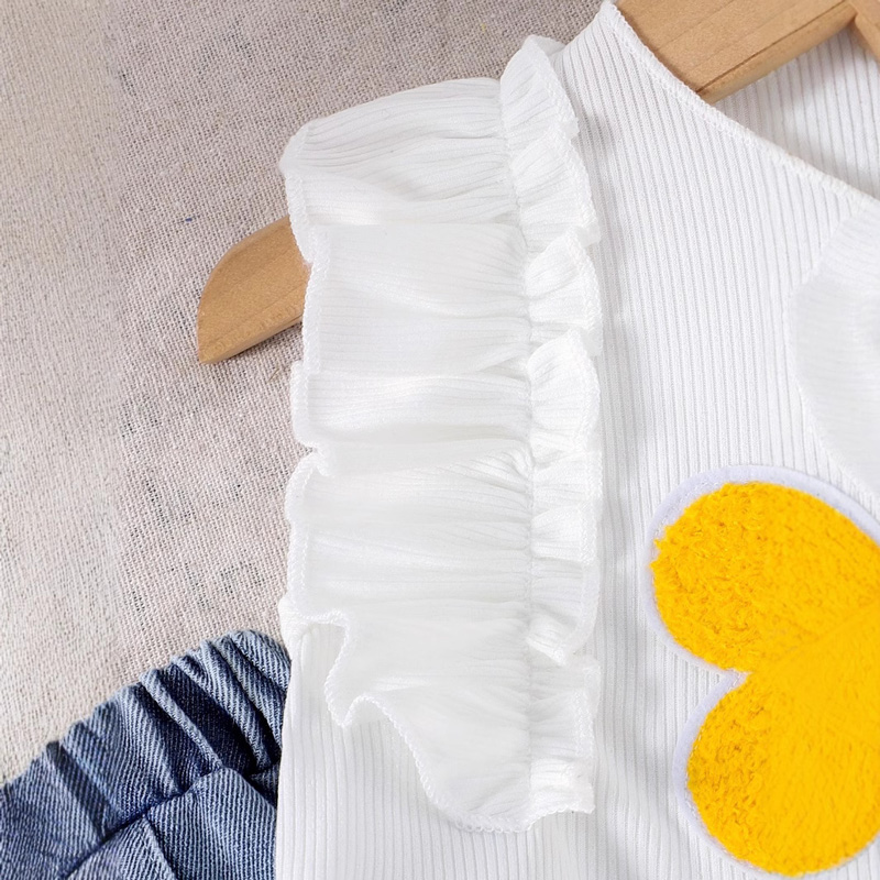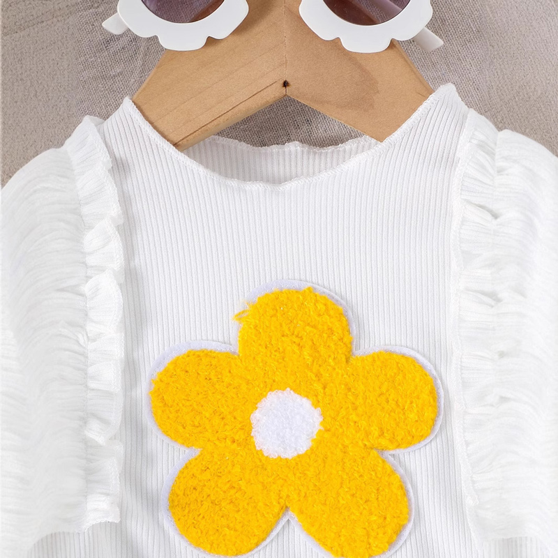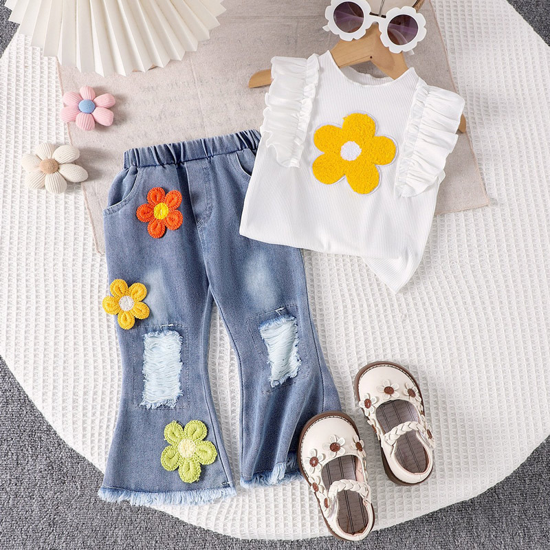 Create a street fashion expert! This girl’s set combines a sweet ruffled sleeveless top (decorated with delicate patch flowers) with cool ripped flared jeans to show a unique personality. Girls summer suits, girls floral tops, summer children’s clothing, sleeveless floral tops, ruffled tops for girls, girls flared jeans, children’s ripped jeans, appliqué children’s clothing, fashionable girls suits, girls’ trendy clothing