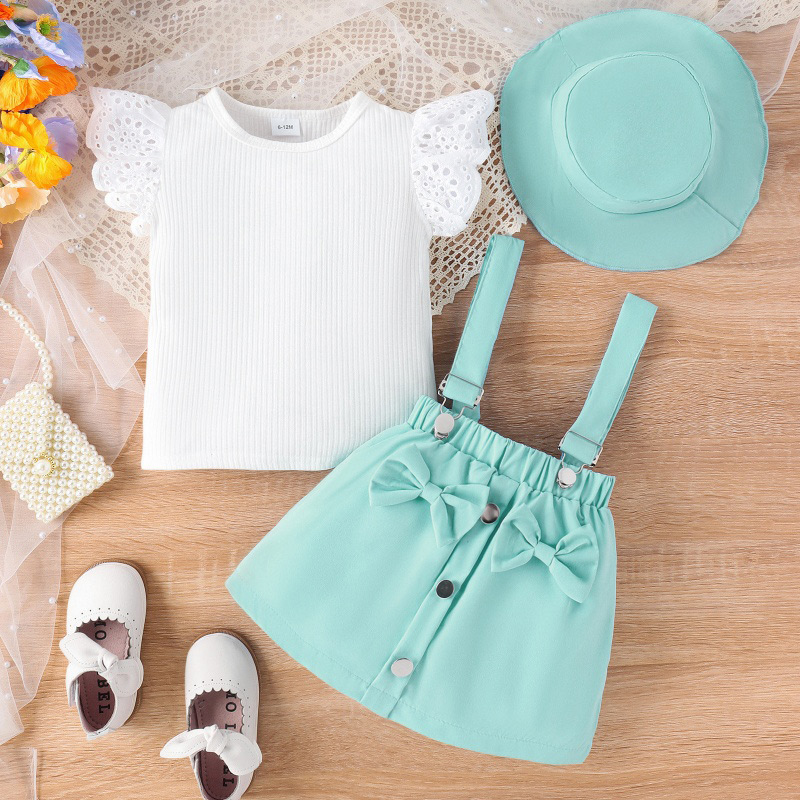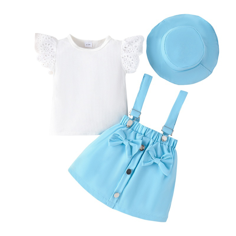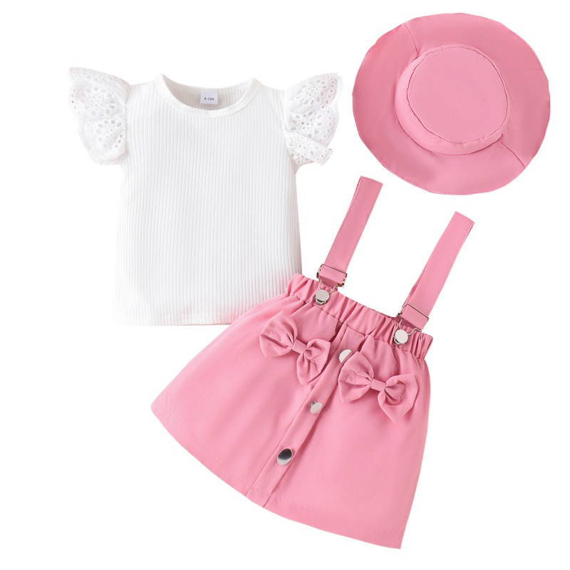 Girls Flying Sleeve Top with Suspender Skirt Hat Girls Set