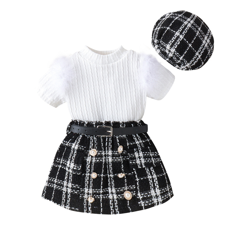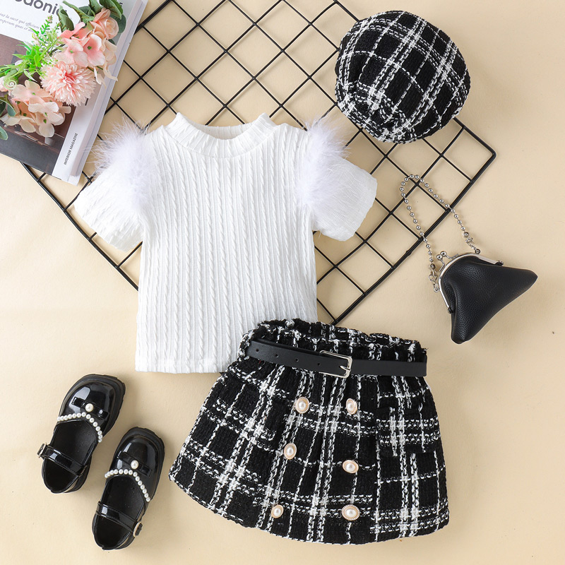 Girls’ patchwork furry short-sleeved top with Chanel style skirt set