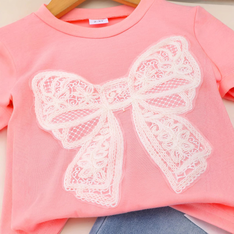 🌟 Three-dimensional bow short-sleeved T-shirt for girls: pure cotton fabric is skin-friendly and breathable, the three-dimensional bow design on the chest is playful and eye-catching, white/light pink is fresh and versatile, and it is easy to wear a sweet girlish feeling.