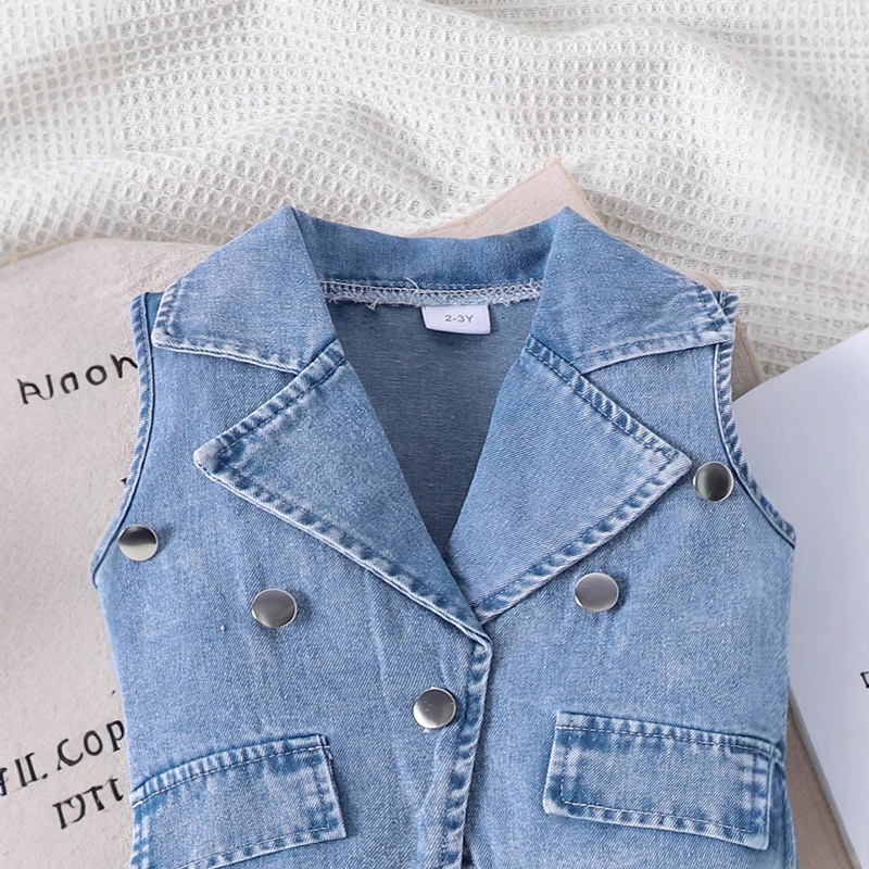 Lapel girls denim vest with solid color jumpsuit