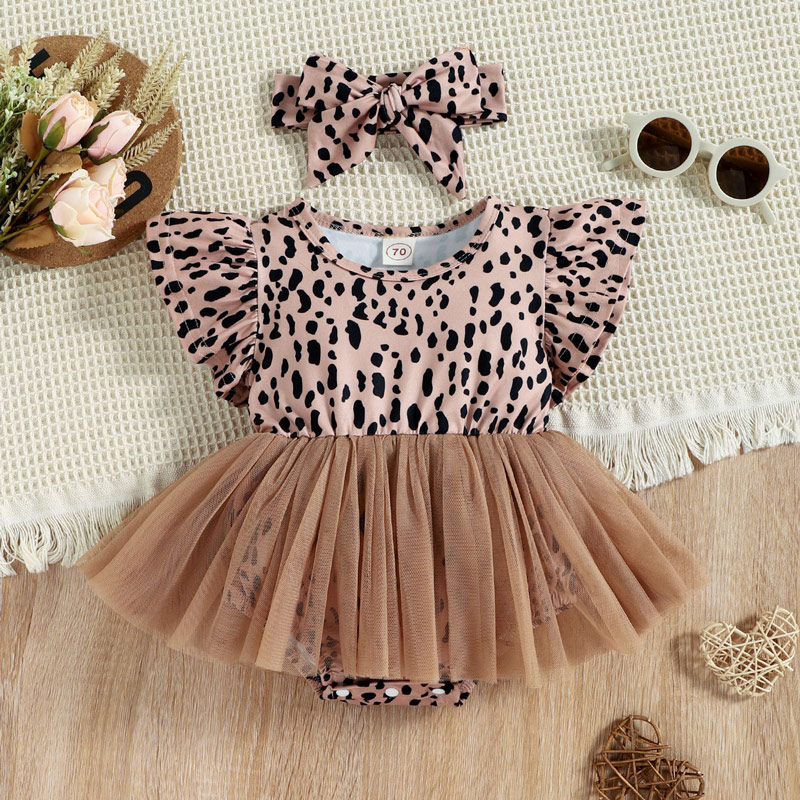 This European and American leopard print flying sleeve baby romper is specially designed for fashionable little princesses. It adopts the hot-selling design elements of ins, combines wild leopard patterns with light mesh skirts, and shows a unique style of coolness and sweetness. The flying sleeve design is smart and cute, the fabric is soft and breathable, and it protects the delicate skin of infants and young children. It is an ideal choice for going out, taking pictures, and gatherings in spring and summer. With a snap design, it is easy to put on and take off and change diapers.