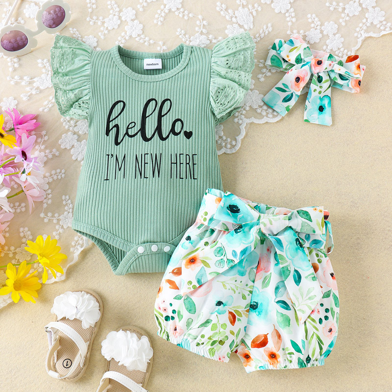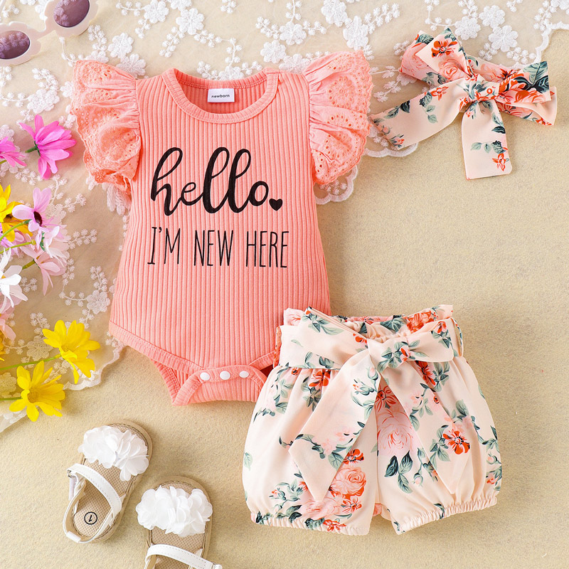 Be the first to review “Printed flying sleeve baby girl romper with shorts and headdress set”