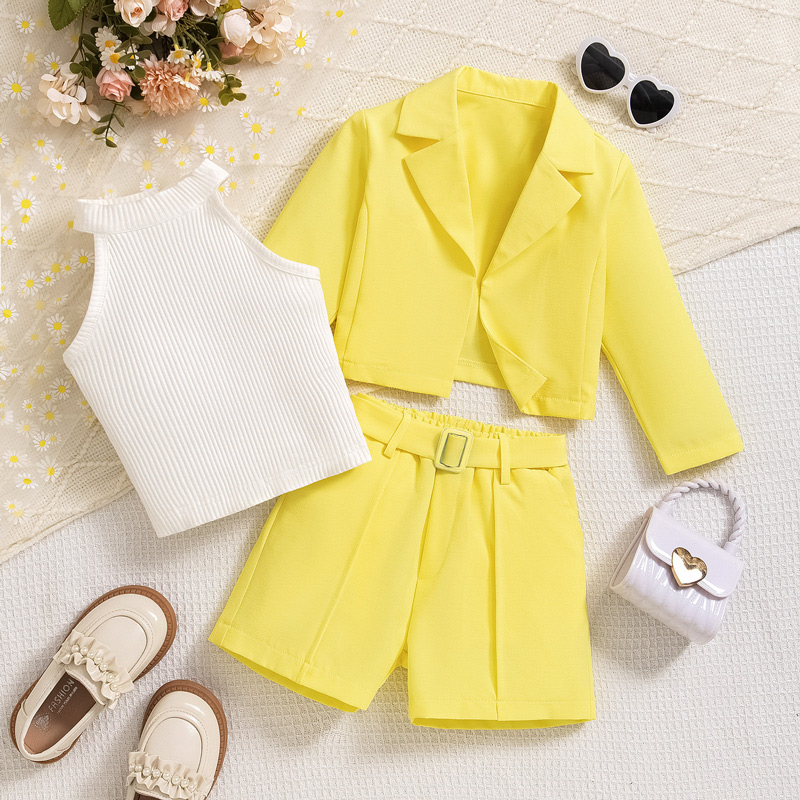 Let your little princess easily lead the trend! This spring and autumn girl’s suit shorts set, paired with a cool halter neck girl’s inner wear, can show a unique personality, whether it is for parties or daily wear, and is versatile and fashionable. Girls suits, spring and autumn children’s clothing, fashionable girls, suits for girls, shorts suits for girls, halter tops, children’s suit jackets, children’s fashionable suits, fashionable outfits for girls