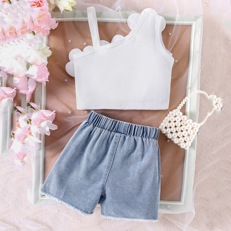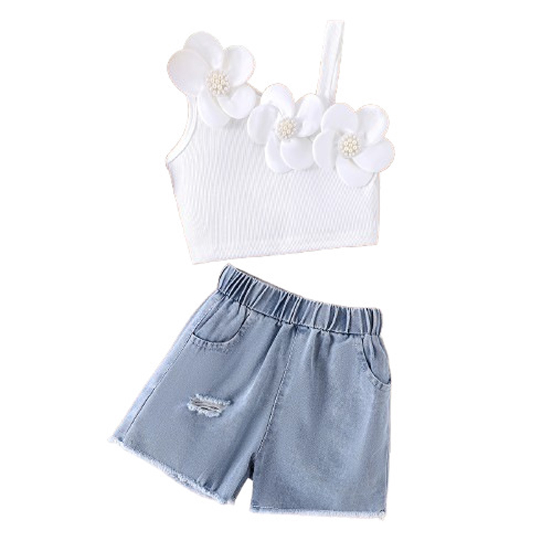 Embrace the summer trend, start with this girls two-piece set! Girls camisole adopts an asymmetrical oblique shoulder sling design, cleverly showing the shoulder line, and is full of fashion. The details of the three-dimensional flowers highlight the quality and design sense. The matching denim shorts are the hottest ripped elements of this season. They are made of soft and skin-friendly high-quality denim, which is durable and stylish, allowing babies to play freely. The elastic waist design adapts to different body shapes and is more comfortable to wear. One set solves the troubles of summer dressing, allowing babies to maintain a fashionable attitude while playing!
