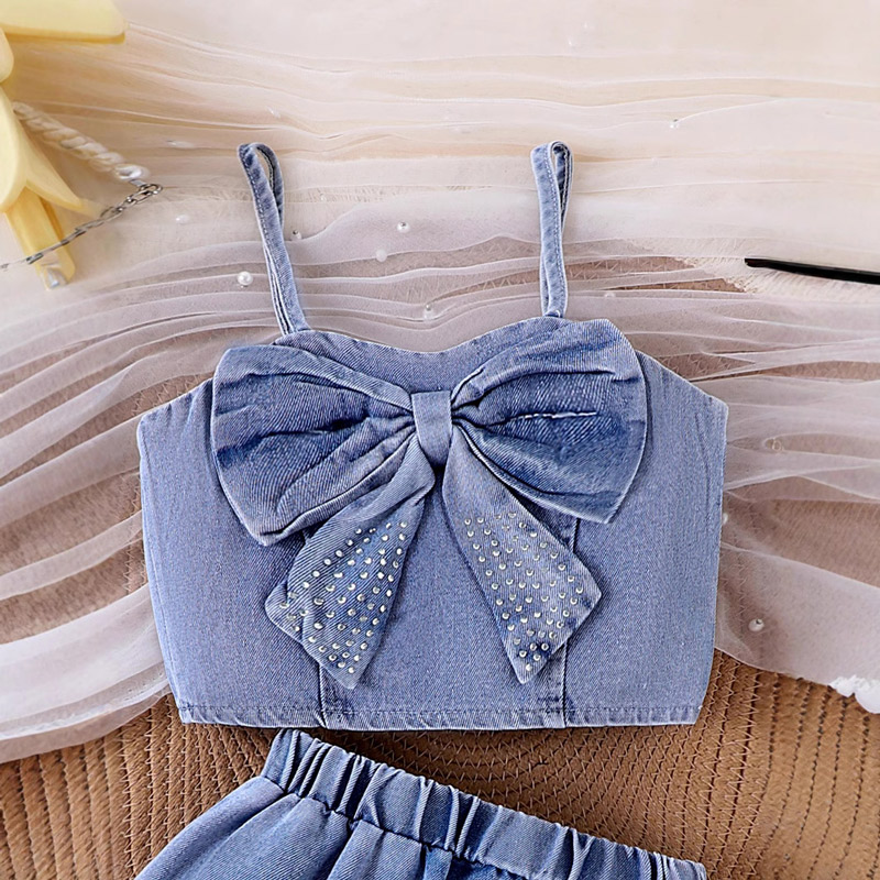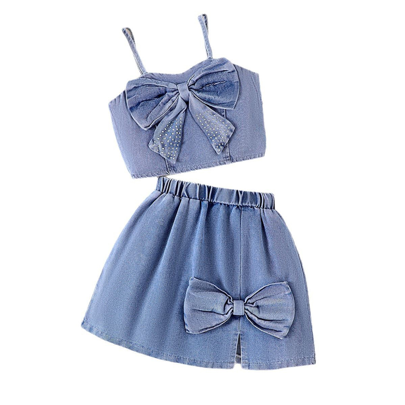 Capture the latest European and American children’s fashion! This two-piece set includes a chic girls bow tie halter top and a designer slit denim skirt, let your baby easily walk in the forefront of fashion.Girls Bow Tie Camisole, European and American style children’s clothing, bow tie halter girl, children’s denim skirt suit, summer two-piece set, girls undershirt dress, slit denim skirt, fashionable children’s clothing, cute girls suit, new children’s clothing