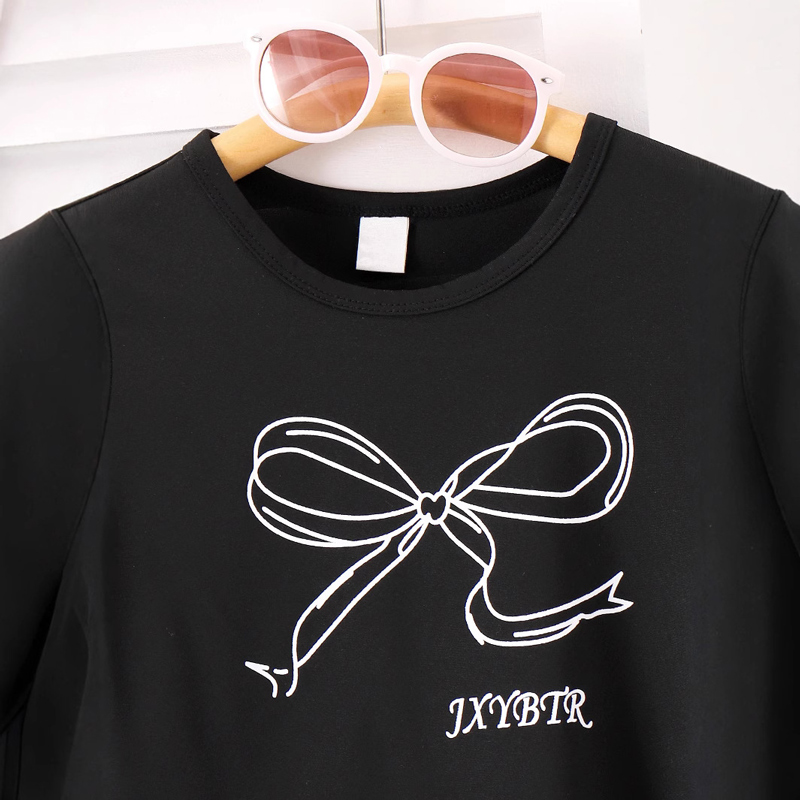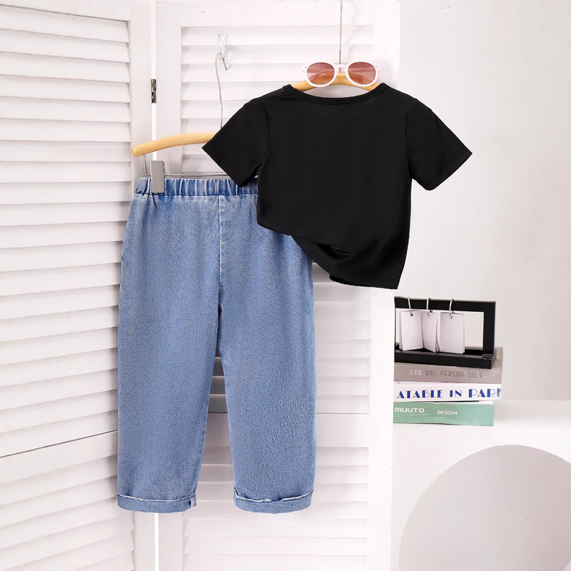 Make summer dressing a breeze with this delightful girls set. The Girls printed T-shirt is made of comfortable, breathable fabric (perfect for warm weather) in a versatile solid color, and is embellished with a playful bow print to add a touch of sweetness. The matching denim pants provide a classic look and durability, perfect for playtime or casual outings. This outfit combines comfort and style to ensure your little one looks beautiful and feels comfortable all season long. It’s easy to separate and pair too!