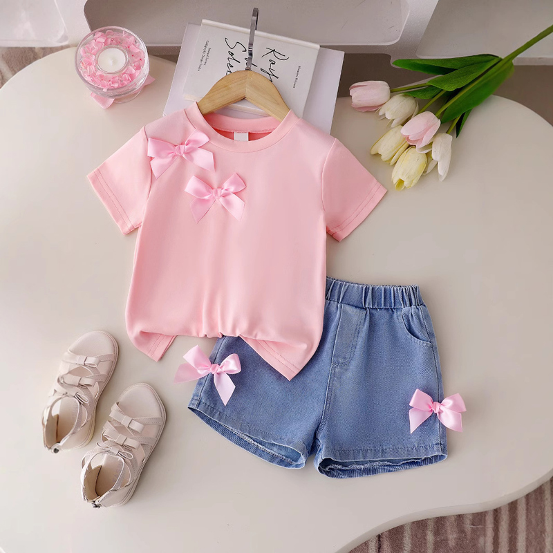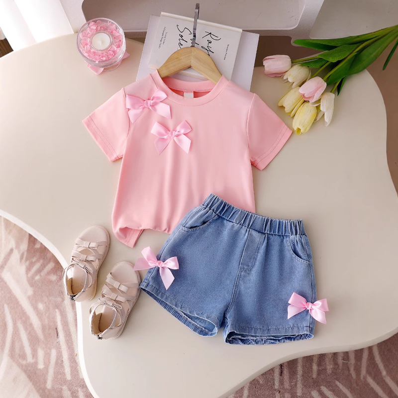 This summer girls’ suit is designed with sweetness and vitality as the core. The round-neck short-sleeved top is made of soft and breathable 65% cotton + 35% polyester fabric. The neckline is decorated with three-dimensional bow decorations, which instantly enhances the overall playful feel. Paired with high-waisted denim shorts, the trouser legs are slightly curled to show the child’s lively temperament. The refreshing sky blue and light pink color scheme not only sets off the skin tone but also makes it more refreshing. Whether it is for travel or daily wear, it can let the little princess release her sweet charm in summer.