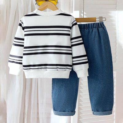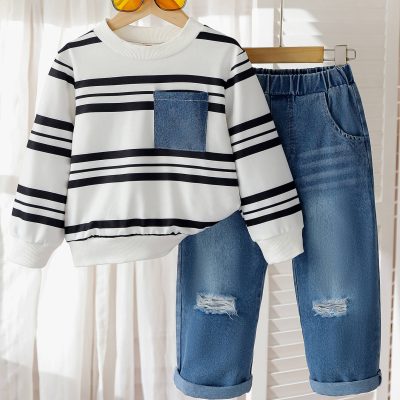Autumn and winter boys’ striped sweatshirt and ripped denim pants